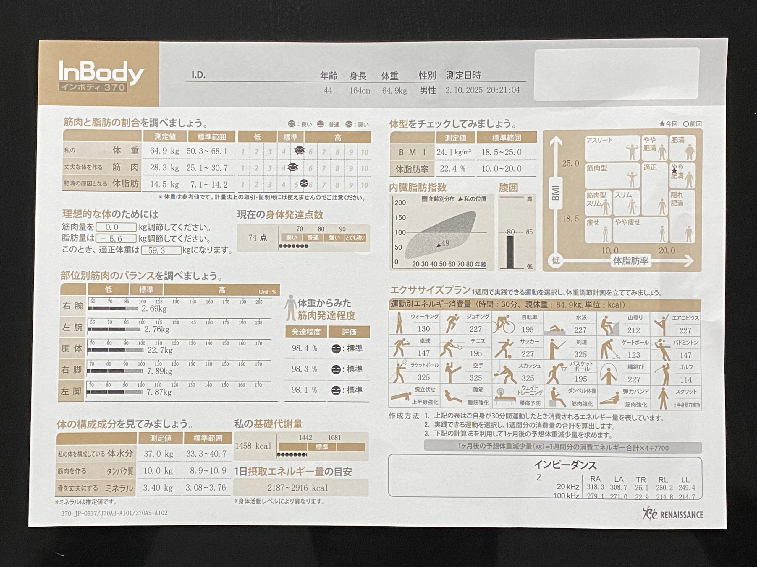 ストレッチ後にインボディで計測しました。体脂肪率が先月と比べて3.4%も減ったので嬉しいです。このまま早朝ウォーキングと筋トレを続けていきたいと思います。